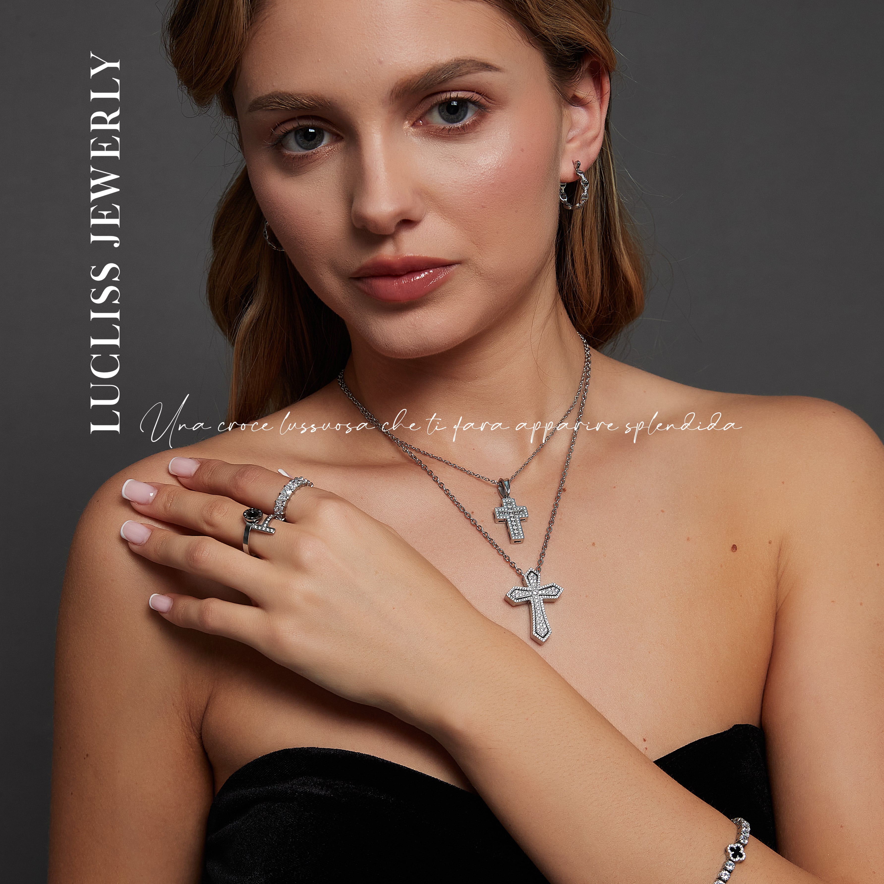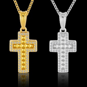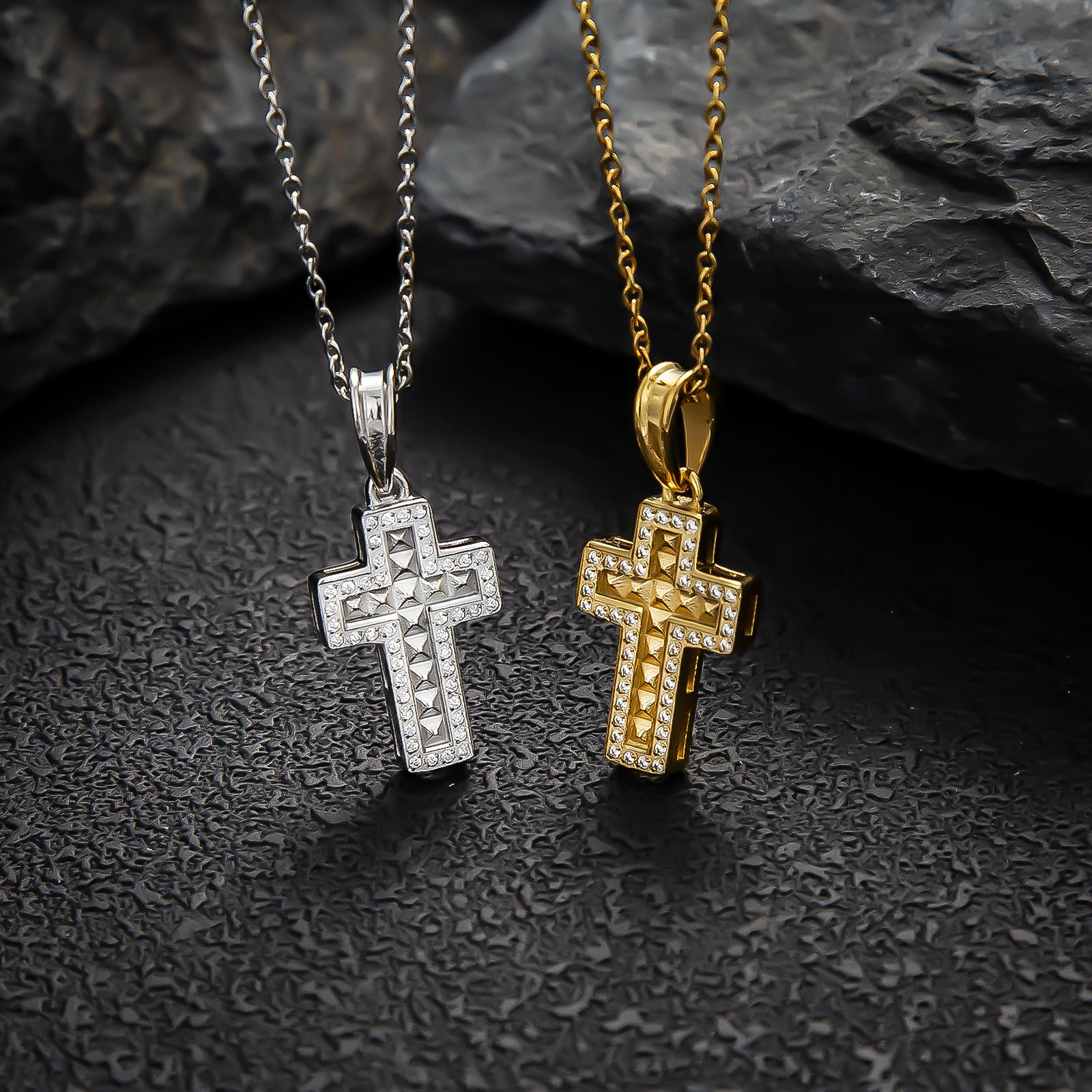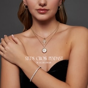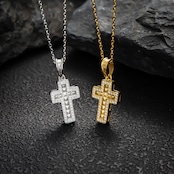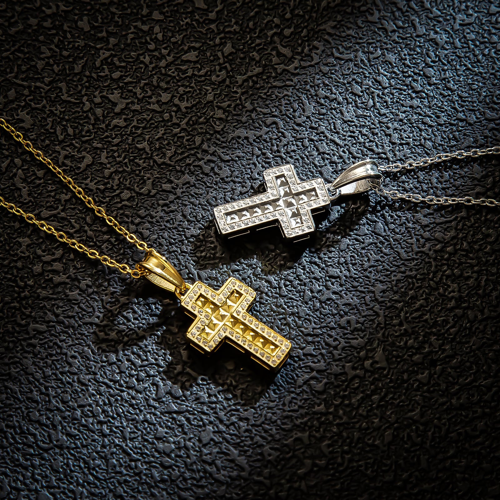・真ん中のスタッズ形状をジルコニアが覆う小ぶりながらも上品なクロスネックレス。